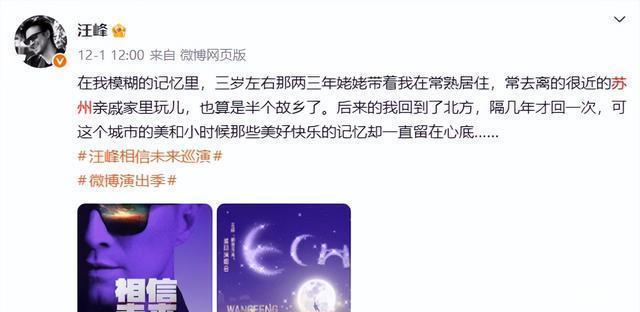 歌手汪峰 还在其微博中分享 自己在苏州的童年经历 并将苏州视为半个故乡 ↓ “在我模糊的记忆里,三岁左右那两三年姥姥带着我在常熟居住,常去离的很近的苏州亲戚家里玩儿,也算是半个故乡了。后来的我回到了北方,隔几年才回一次,可这个城市的美和小时候那些美好快乐的记忆却一直留在心底……”