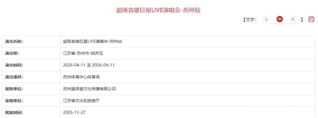 ■超级音雄巨星LIVE演唱会苏州站 演出时间:2026年4月11日 演出地点:苏州体育中心体育场
