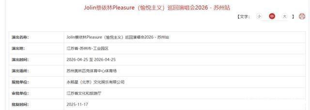 ■Jolin蔡依林Pleasure(愉悦主义) 巡回演唱会2026苏州站 演出时间:2026年4月25日 演出地点:苏州奥体中心体育场